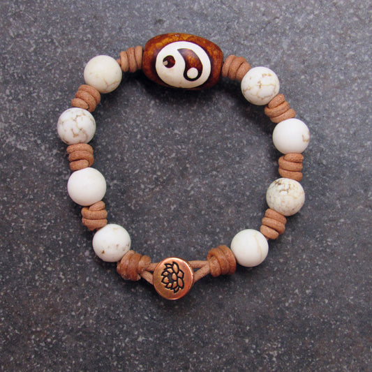 Tibetan Agate Gemstone Yin Yang with White Turquoise on natural Leather