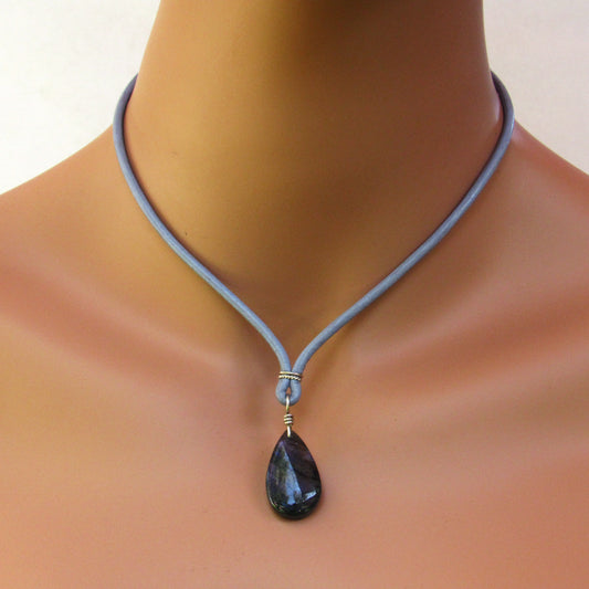 Blue Flame Labradorite gemstone Hand Wrapped on Leather W/ Sterling Silver