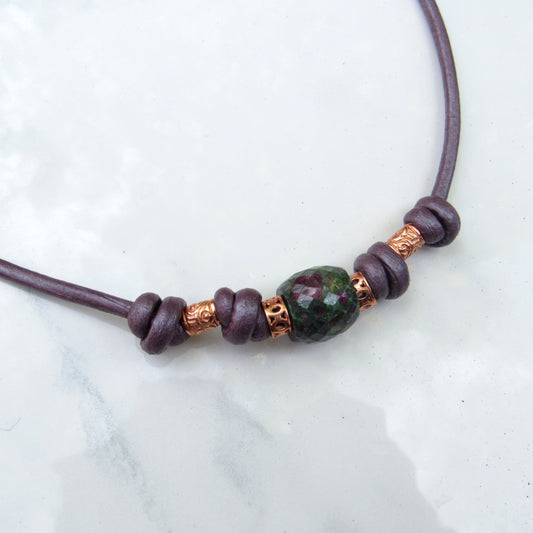 Ruby Zoisite and Copper Hand Knotted on Leather necklace