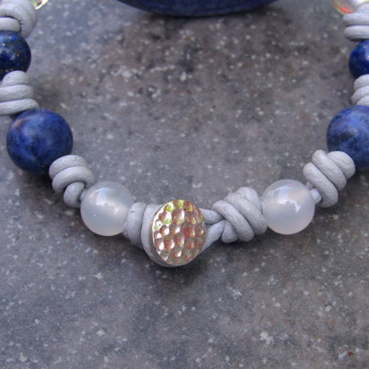 Flower Carved Agate, Sodalite gemstone, Clear Quartz, Leather Hand Knotted W/ Sterling Silver Button