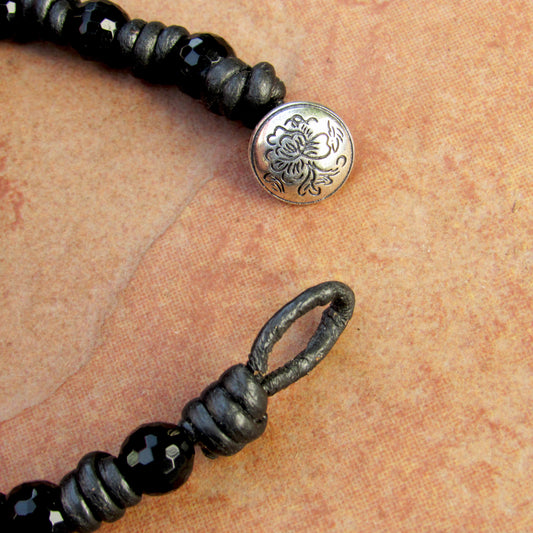 Leather Knotted Leopard Print Jasper Gemstone, Faceted Onyx, and Sterling Silver Button Bracelet