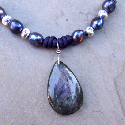 Purple Teardrop Labradorite Pendants, Freshwater Pearls, Sterling Silver Beads and Clasp on Purple Leather