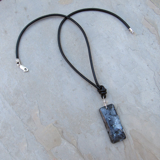 Black Labradorite (Larvikite) gemstone on Leather with Sterling Silver