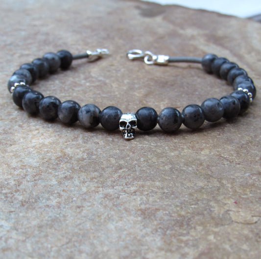 Labradorite or Quartz with Sterling Silver Skull Leather Bracelet