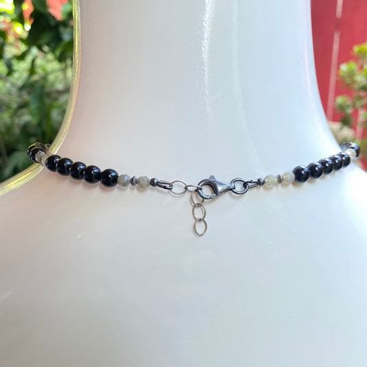 Men's Labradorite, old black jade, and silver smoke jasper, and oxidized sterling silver necklace