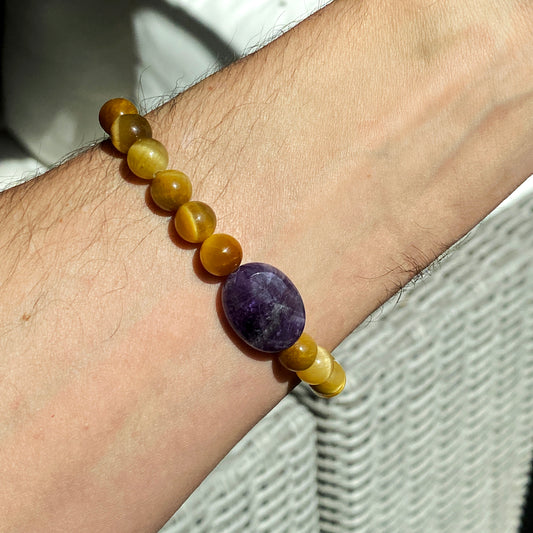 Men’s Golden TigerEye Gemstone Bracelet with Amethyst and Purple Skull stretch bracelet