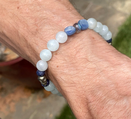 Aquamarine, labradorite, blue sapphires, pyrite skull, and kyanite gemstone bracelet