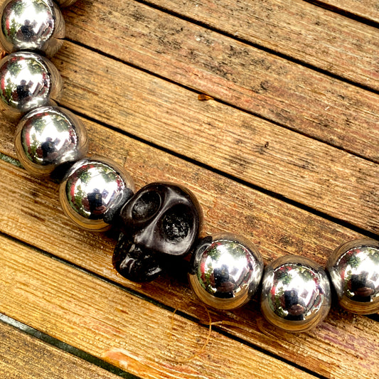 Men’s Silver hematite and Black Howlite Skull Gemstone Bracelet