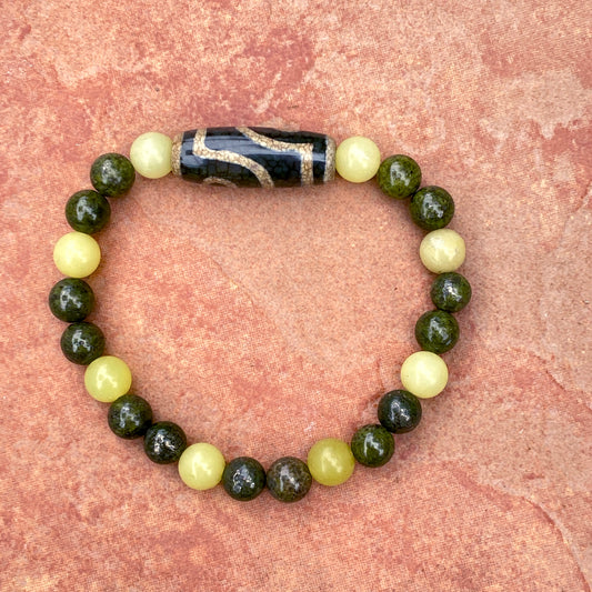 Men's Lemon Jade, green Pyrite, and Tibetan Agate Gemstone stretch Bracelet
