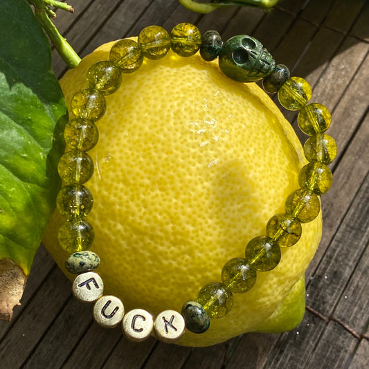Men’s peridot, green pyrite, green Schiller sheen spar "curse" bracelet