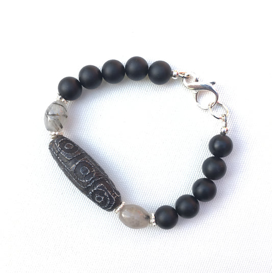 Men's Tibetan Agate, Rutilated Quartz matte Onyx and sterling silver bracelet