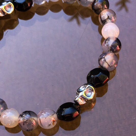 Men’s Hematite skull and Dragon Vein Agate with Black Agate gemstone stretch bracelet