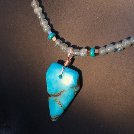 Blue Agate Bronzite pendant with Apatite, Hematite & Turquoise Gemstones