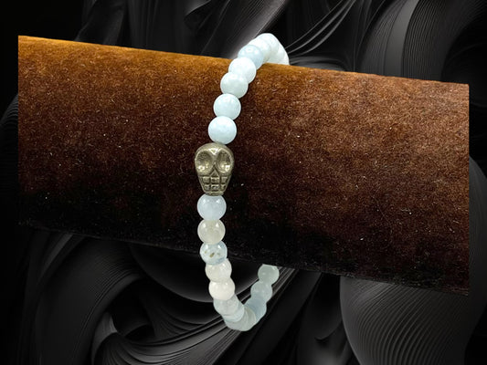 Aquamarine gemstones and Pyrite Skull stretch Bracelet