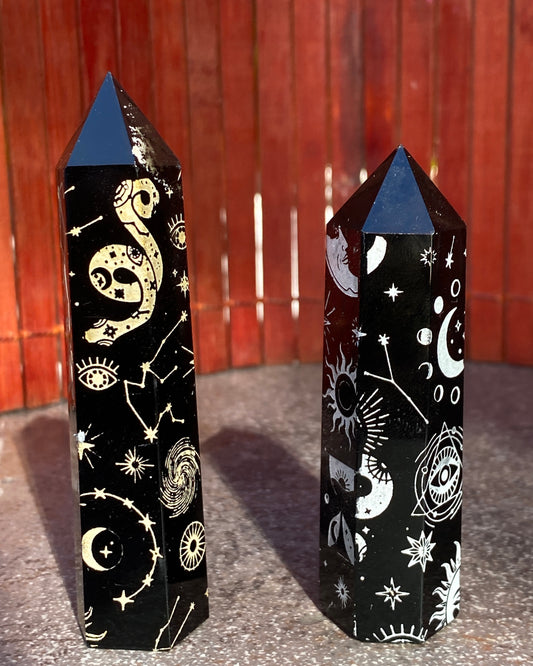 Black Obsidian gemstone 5 Point Wands with symbols