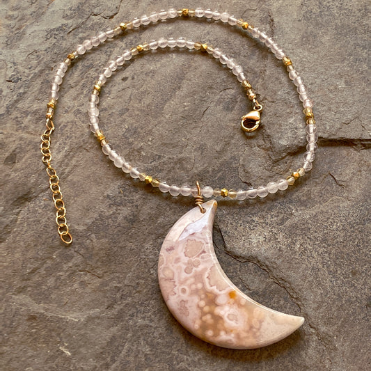 Cherry blossom agate moon pendant, on Rose quartz, citrine, 14 kt GF necklace