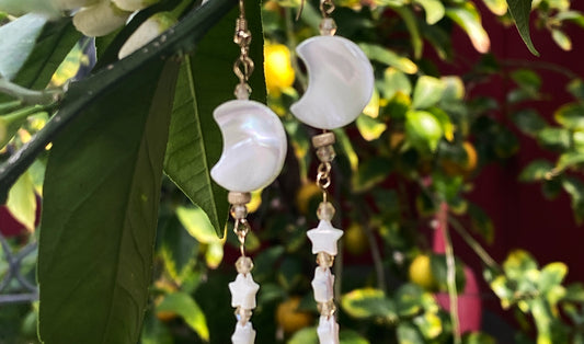 Mother of Pearl Moon & Stars with Citrine Gemstones drop earrings.