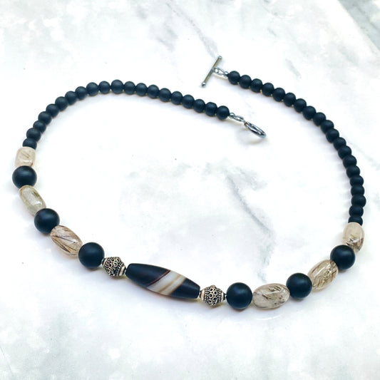 Tibetan Agate, Sterling Silver, Onyx, and Rutilated Quartz,