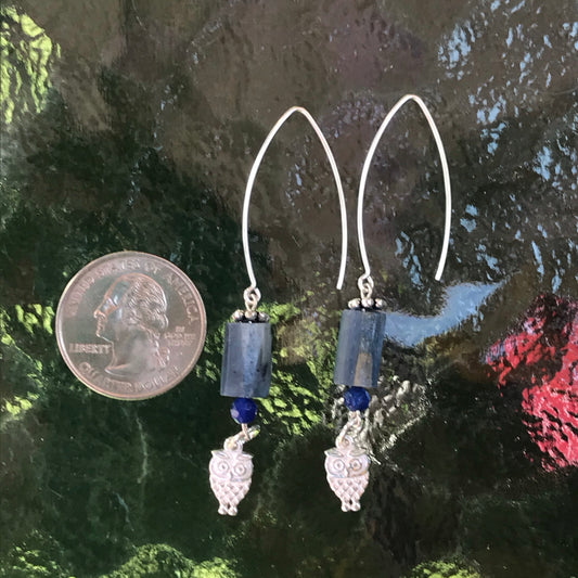 Sterling silver owl and kyanite and sapphire jade earrings