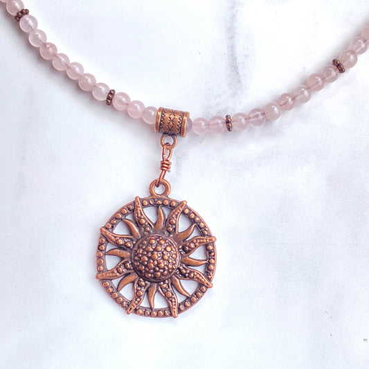 Rose Quartz gemstone and copper Sun pendant beaded necklace