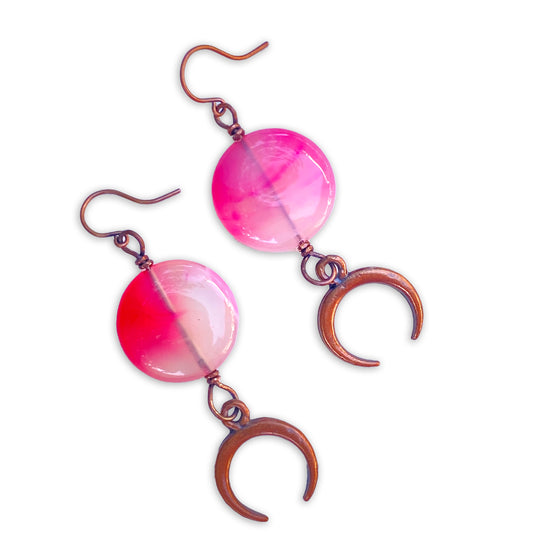 Pink agate gemstone wrapped copper Moon dangle earrings