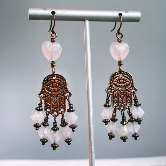 Rose Quartz and copper Hamsa Earrings
