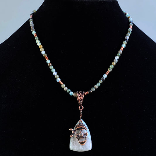 Prehnite gemstone with Copper Pirate Skull pendant necklace