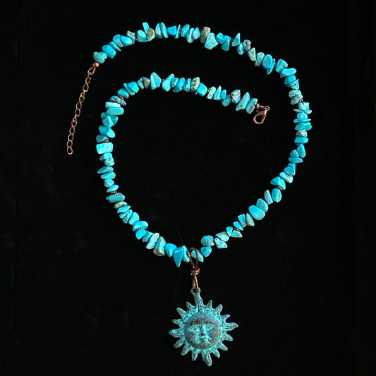 Natural Turquoise gemstone and copper Sun pendant beaded necklace