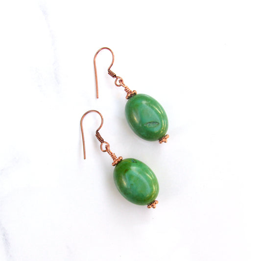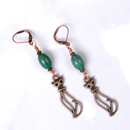 Green Agate gemstone and Copper Kitty Cat Drop Earrings