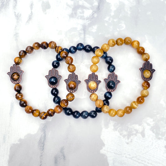 Men's Tiger Eye gemstone and copper Hamsa bracelet.
