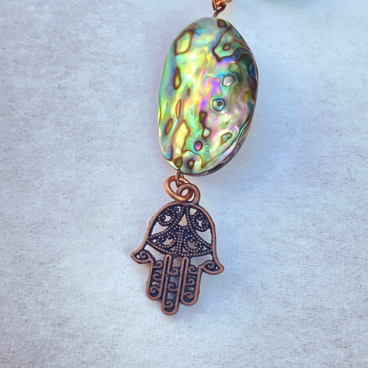 Copper, Abalone shell, Green Onyx gemstone and Hematite Hamsa necklace