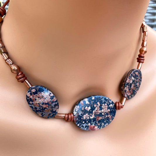 Leopard Print Jasper and Genuine Copper Hand Knotted on Leather