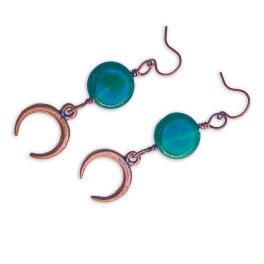 Green Onyx gemstone wrapped copper Moon dangle earrings