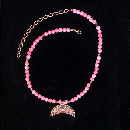 Pink Angelite and Pink Tourmaline gemstone and copper Moon pendant necklace