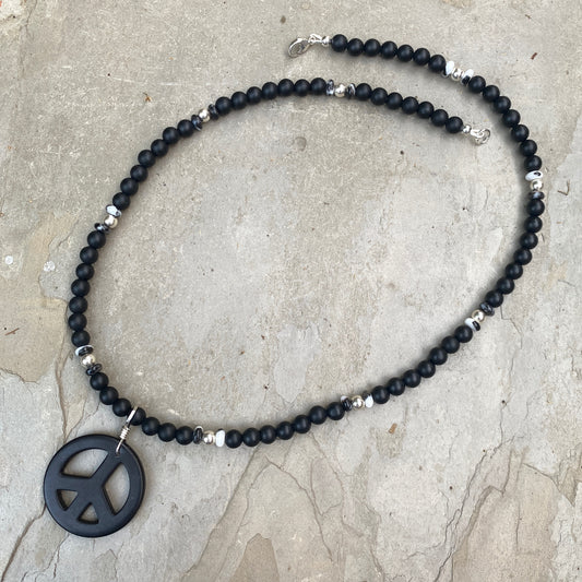 Howlite Peace Sign, Onyx, Sterling Silver, and Zebra Jasper Necklace