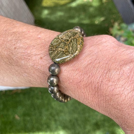 African Green Breciated Jasper Gemstone, Pyrite, Fluorite Stretch Bracelet
