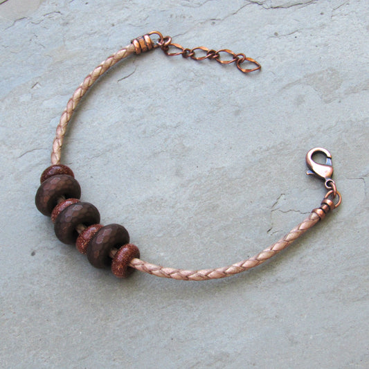 Men’s Copper, Hematite, Goldstone gemstones on genuine Leather clasp bracelet