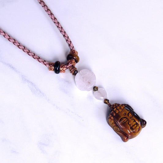 Tiger Eye Buddha Copper, Rose Quartz Flower, on Tan Braided Leather with Copper Clasp