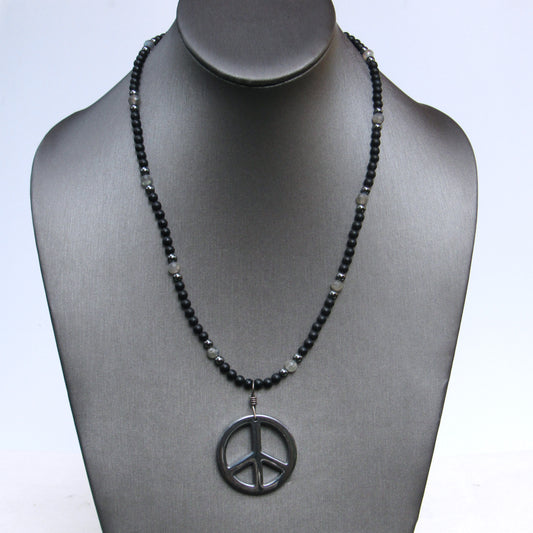Hematite Peace Pendant, Hand Wrapped w/ Oxidized Sterling Silver, Matte Black Onyx, and Labradorite Men’s Necklace