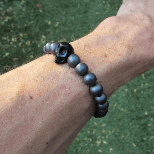 Matte Hematite Gemstones and Howlite Skull Men’s Stretch Bracelet