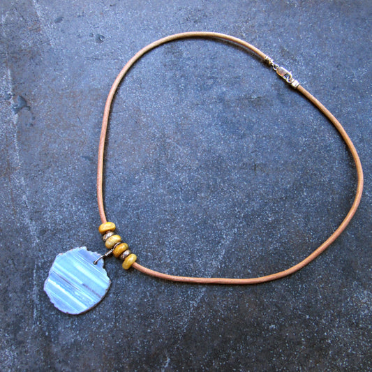 Grey Striped Agate gemstone, Yellow jasper, Sterling Silver on Leather Necklace
