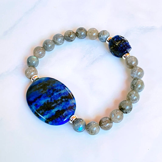 Lapis Lazuli gemstone Skull with Sterling Silver and Labradorite Bracelet
