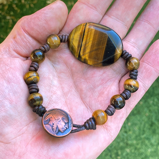 Tiger Eye and Brass Hand Knotted on Natural Leather Necklace