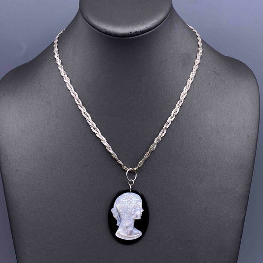 Onyx and Mother of Pearl Cameo on Repurposed Vintage Silver Chain
