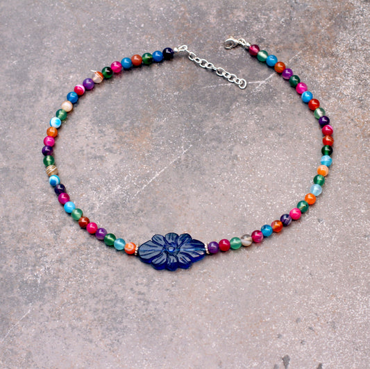 Multicolored Agate Gemstone Necklace with Carved Blue Agate Flower Pendant