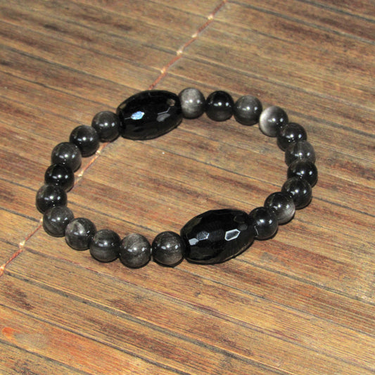 Chunky Black Onyx and Silver Obsidian Gemstone Stretch Bracelet