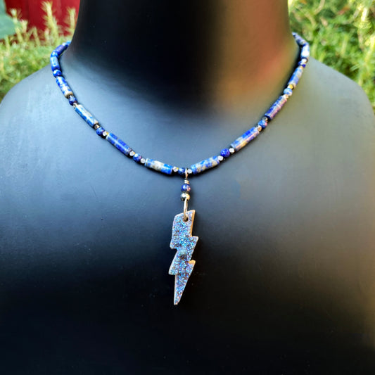 Women’s Blue Druzy Bolt Wired w/ Oxidized Sterling Silver and Lapis Lazuli Necklace