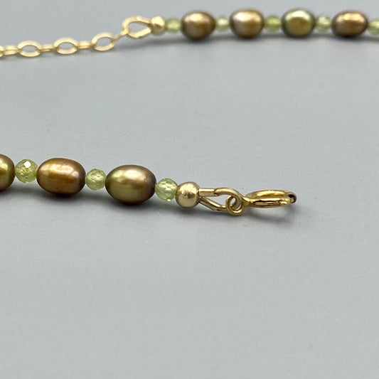 Freshwater pearl, Peridot, Mother of Pearl Moon Choker Necklace w/ 14 kt GF