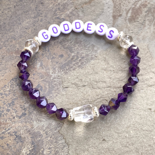 Amethyst gemstone, Clear Quartz, and Sterling Silver “Goddess” Stretch Bracelet