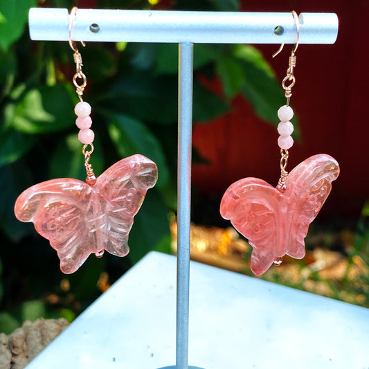 Cherry Quartz Gemstone Butterfly Earrings with Pink Opals & Rose gold findings